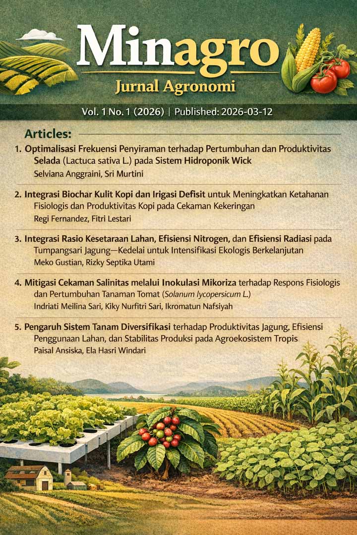 Penelitian ini bertujuan mengevaluasi sistem tumpangsari jagung–kedelai dalam meningkatkan efisiensi penggunaan lahan dan produktivitas total melalui pendekatan intensifikasi ekologis. Keterbatasan lahan pertanian dan tingginya ketergantungan terhadap pupuk nitrogen sintetis menuntut sistem budidaya yang lebih efisien dan berkelanjutan. Penelitian dilaksanakan menggunakan Rancangan Acak Kelompok dengan enam perlakuan, terdiri atas sistem monokultur dan beberapa variasi proporsi tumpangsari substitusi serta aditif. Parameter utama yang dianalisis meliputi Rasio Kesetaraan Lahan (Land Equivalent Ratio/LER), Efisiensi Penggunaan Nitrogen (Nitrogen Use Efficiency/NUE), dan Efisiensi Penggunaan Radiasi (Radiation Use Efficiency/RUE). Data dianalisis menggunakan ANOVA pada taraf 5% dan dilanjutkan dengan uji DMRT. Hasil menunjukkan bahwa seluruh sistem tumpangsari memiliki nilai LER > 1, dengan nilai tertinggi pada sistem aditif (1,42), yang menunjukkan peningkatan efisiensi lahan sebesar 42% dibandingkan monokultur. Sistem tumpangsari juga meningkatkan NUE dan RUE secara signifikan, terutama pada proporsi kedelai yang lebih tinggi. Temuan ini menegaskan bahwa integrasi serealia–legum mampu meningkatkan produktivitas melalui komplementaritas ekologis dan efisiensi sumber daya.